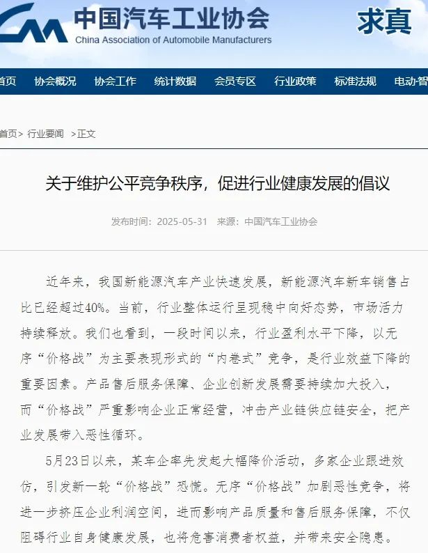 5月31日,中国汽车工业协会四点《倡议》强调“所有企业严格遵循公平竞争原则,依法依规开展经营活动”、“优势企业不为垄断市场,挤压其他主体生存空间,损害其他经营者合法权益”、“企业在依法降价处理商品以外,不以低于成本的价格倾销商品”、“所有企业应对照国家相关法律法规进行自查整改”。