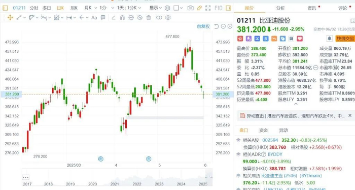 然而,资本市场的反应却与消费端的热情形成鲜明反差,比亚迪股价率先以“下跌”作出回应。其“以价换量”的策略,引发投资者对行业价格战全面升级的担忧,这种悲观情绪直接投射在股价走势上,呈现出“跌跌不休”的态势:比亚迪宣布降价的第二个交易日,港股汽车股全线受挫,比亚迪股价单日跌幅超8%;跌势持续深化:6 月2日,港股比亚迪盘中一度跌逾4%,且上周累计跌幅已超 15%;高点回调扩大:数据显示,比亚迪当前股价较历史纪录高点跌幅已超 17%,市场对行业盈利前景的分歧进一步加剧。
