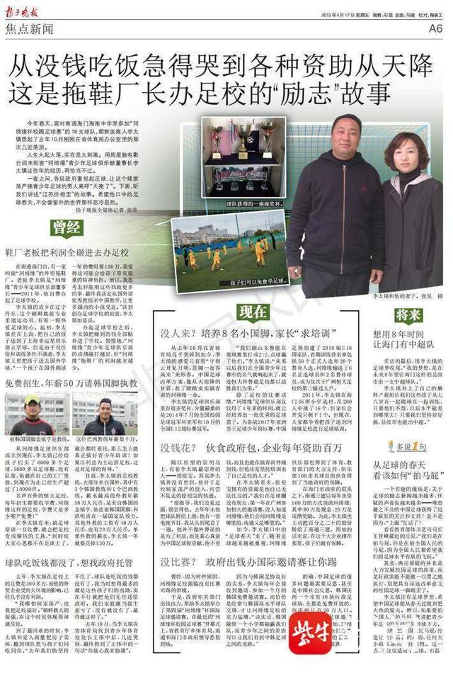 做拖鞋,江苏珂缔缘董事长李太镇坚守品质,搞足球,李太镇也可谓初心不改。李太镇是黑龙江五常市朝鲜族人,曾是一名摔跤运动员,更是一名狂热的足球迷。