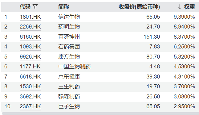 恒生医疗保健指数:前十大权重的累计占比为56.84%,其中信达生物、药明生物、百济神州权重占比超8%。