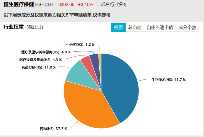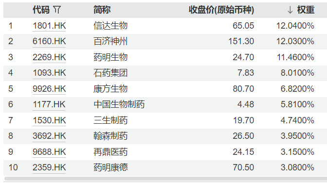 恒生港股通医疗保健指数:前十大权重的累计占比为71.09%,其中信达生物、百济神州、药明生物的权重占比超10%。