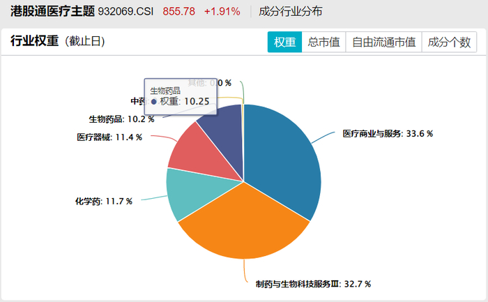 中证港股通医疗主题指数:按照中证三级行业划分,医疗商业与服务占比33.6%、制药与生物科技服务占比32.7%、化学药占比11.7%,医疗器械、生物药品、中药也有一定占比。