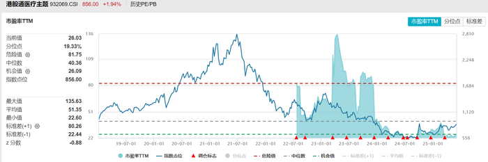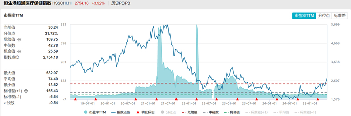 恒生医疗保健指数:目前的市盈率TTM已回到历史中位数附近。