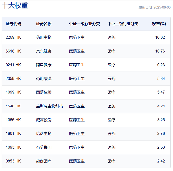 中证港股通医疗主题指数:前十大权重股累计占比59.86%,其中药明生物、京东健康权重占比超10%。