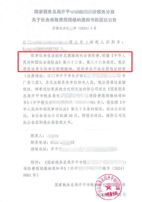 某公司此前收到一份由税务局下发的《社会保险费事项通知书》: