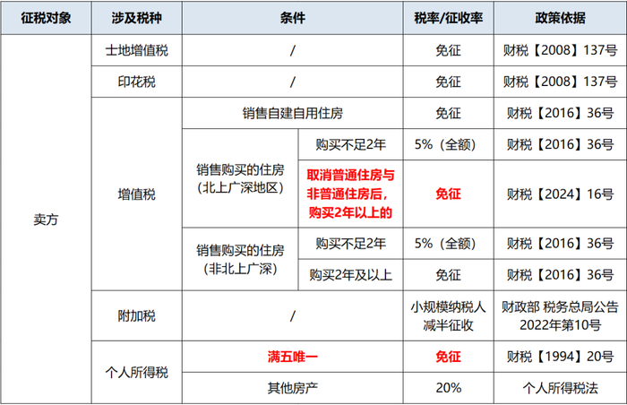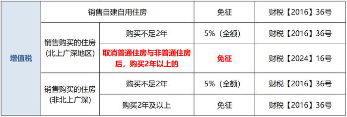 2.北京市、上海市、广州市和深圳市,凡取消普通住宅和非普通住宅标准的,取消普通住宅和非普通住宅标准后,与全国其他地区适用统一的个人销售住房增值税政策,对该城市个人将购买2年以上(含2年)的住房对外销售的,免征增值税。