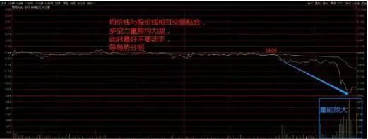 最后再来看一种股价横盘的情况,股价上下波动幅度不大时,在分时中就会出现股价线与均价线相互缠绕的形态,如下图所示。