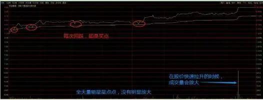 还有第三种情况,下图为正虹科技(000702)的分时图,上午盘中股价波动幅度不大,一直是横盘整理,此时最好只关注,不操作,下午开盘后,图中红色圆圈内所示,股价线上穿均价线,而且成交量不大,说明这个时候关注该股的人还不多,此时可以少仓买入。