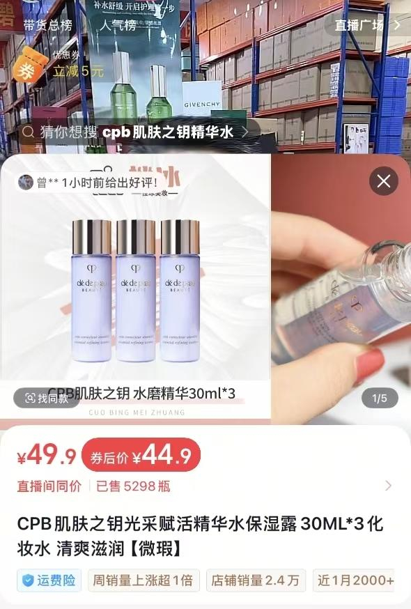 大牌护肤品和化妆品这类美妆个护直播间,也因打折力度大而吸引了众多消费者。打开抖音某博主直播间,正在售卖海蓝之谜、雅诗兰黛、CPB、兰蔻等大牌个护产品的小样。“44.9元,到手3瓶30ml的CPB肌肤之钥的精华水,这几乎相当于一瓶正装的量了,基本相当于专柜旗舰店1折的价格啊!”主播一边介绍着价格一边给直播间的顾客上着链接。