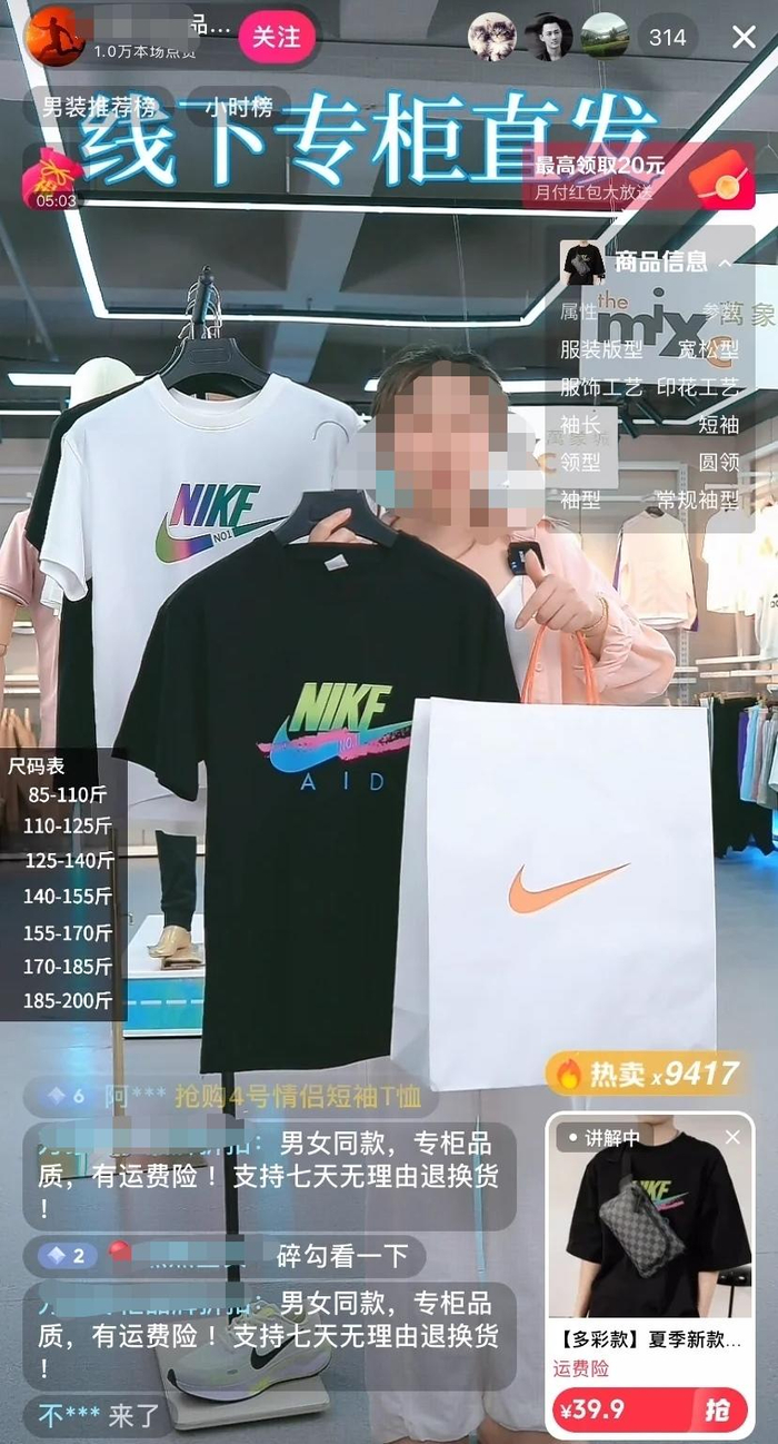 四川消费者小嘻的遭遇更让人觉得有些商家太“明目张胆”。某商场专柜直播间,主播一手拿着有知名品牌耐克LOGO的白色纸袋,一手拿着主推的T恤,T恤上也有耐克的“对号”LOGO。小嘻并未仔细分辨是不是旗舰店就下了三单,第二天再去找链接,发现店铺已经关了,她意识到自己可能买了假货。小嘻后悔没有录屏,结果又刷到另一个直播间用同样的招式在卖同样的衣服,她赶紧录屏并下单买了两件,只为证明商家卖的也是假货。