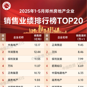 特别声明:房地产企业销售数据统计是以2025年1月1日-5月31日期间销售的商品房为统计口径,包括商品住宅、写字楼、公寓、商业全口径,主要依据中指数据CREIS(点击查看)在郑州市域范围的销售监测数据,并参考当期总体经营情况和推盘去化情况进行分析统计;对于少数没有在监测范围内的企业和项目,由企业提供相关文件,经审核,也纳入统计范围。本报告仅供参考,不对使用报告及其内容所引发的任何直接或间接损失承担责任。