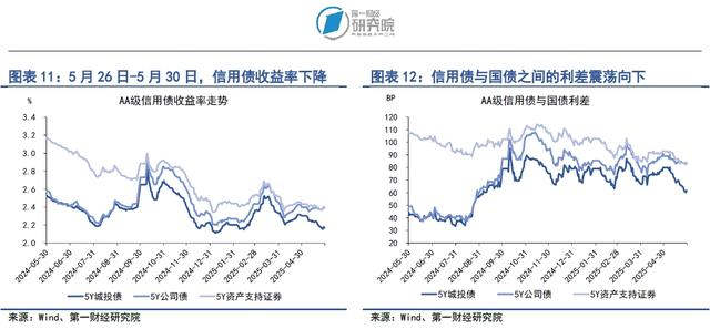 在5月26日至30日当周,各品种信用债收益率普遍下降。在AAA级债券中,5年期城投债、公司债和资产支持证券收益率分别下降3.57BP、2.34BP和2.06BP。在AA级债券中,5年期城投债和资产支持证券收益率分别下降6.44BP和1.01BP。