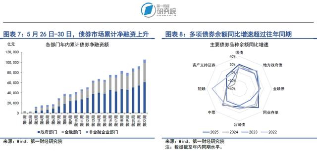 从债券余额增速来看,今年多项债券余额同比增速超过往年同期。截至5月30日,政府部门债券余额同比增速为20.6%,较2024年同期增速上升5.4个百分点;金融部门债券余额同比增速为14%,较2024年同期增速上升2个百分点;非金融企业部门债券余额同比增速为5.6%,较2024年同期增速上升2.5个百分点。
