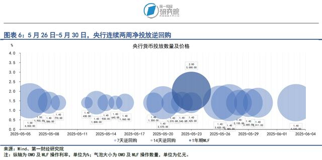 在5月26日至30日当周,面对月末市场资金面偏紧的情况,央行连续第二周通过逆回购向市场净投放资金。上周央行通过7天逆回购共投放资金1.6万亿元,共有9460亿元逆回购到期,净投放资金6566亿元。