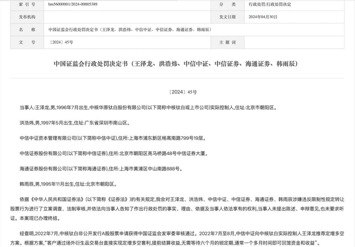 据中国证监会查明,中核钛白实控人王泽龙及其朋友洪浩炜、公司前董秘韩雨辰,以及中信证券、海通证券、中信中证在上述定增发行期间存在违反限制性规定转让股票等情形。2024年4月,王泽龙收到行政处罚决定书,其被罚没约1.33亿元。