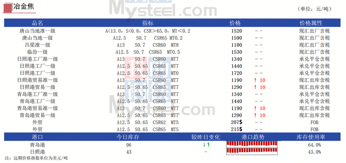 2、截止目前山东两港焦炭库存合计为140万吨,周环比下降2万吨。本周焦炭现货市场继续偏弱运行,钢厂主动去库存,采购减量,影响焦炭向下游传导过程并不顺畅,产地焦炭库存持续累积,连带港口市场表现冷清。虽然今日因市场利多消息刺激黑色系盘面大幅拉涨,但多数参与者认为持续性不强,操作风险较大,暂无入市采购意愿,港口询盘仍然较少,报价随盘面小幅上涨,目前港口准一级冶金焦报价在1200-1230元/吨左右。