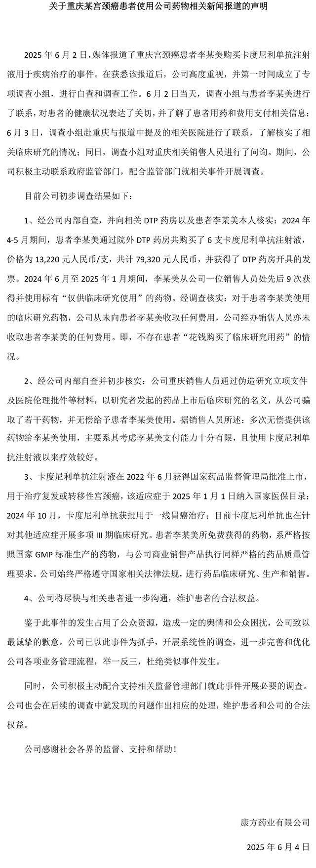 6月4日,康方生物(09926)针对“临床试验抗癌药流入市场”事件发布声明称,重庆销售人员冉登元通过伪造研究立项文件及医院伦理批件等材料,以“研究者发起的药品上市后临床研究”名义,从公司骗取卡度尼利单抗注射液若干,并无偿提供给宫颈癌患者李某美使用。公司强调从未向患者收取任何费用,销售人员亦未收费,否认存在“患者花钱购买临床研究用药”行为。