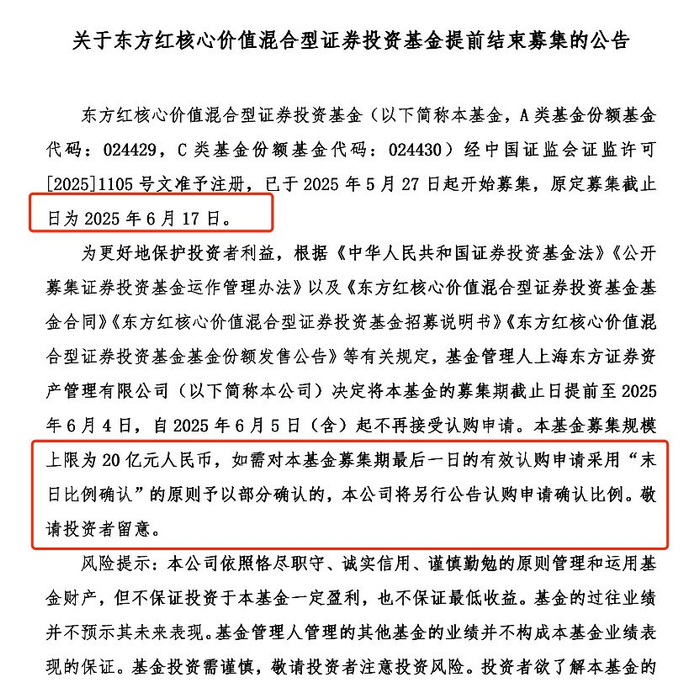 6月4日,东方红资管公告称,旗下浮费基金东方红核心价值自6月4日提前结束募集,6月5日起不再接受新的认购申请。根据此前发售公告,该基金自5月27日发行,原定募集截止日为6月17日,预计募集上限为20亿元。