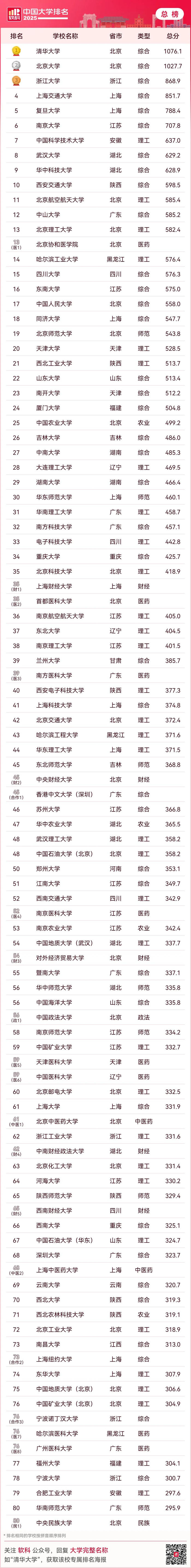 2025软科中国大学排名(总榜,含财经、政法、医药等单科性大学)