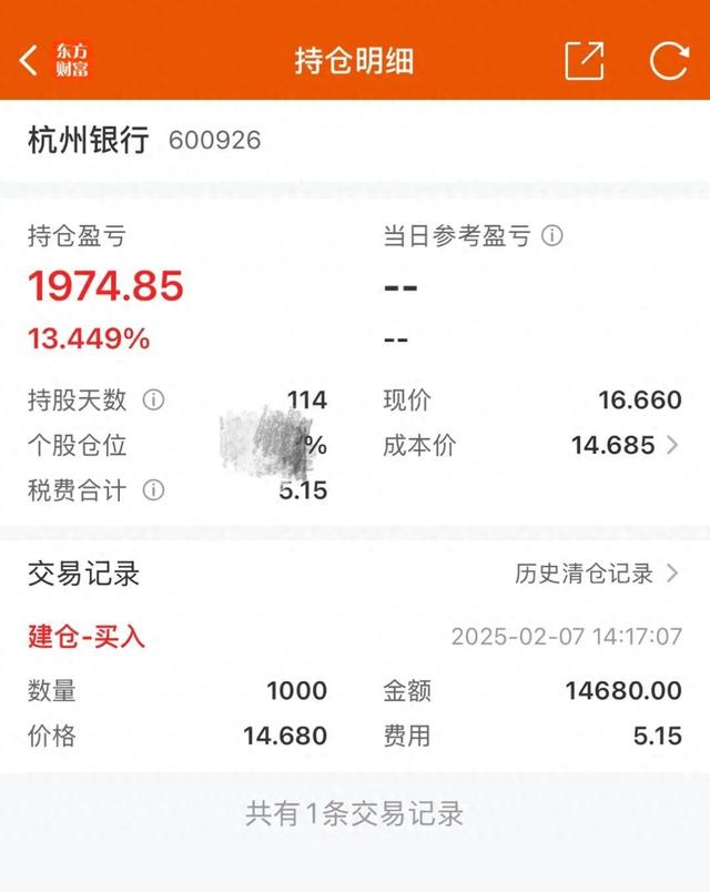 “你选的这个银行股,表现很不错,已经赚了将近14%。”