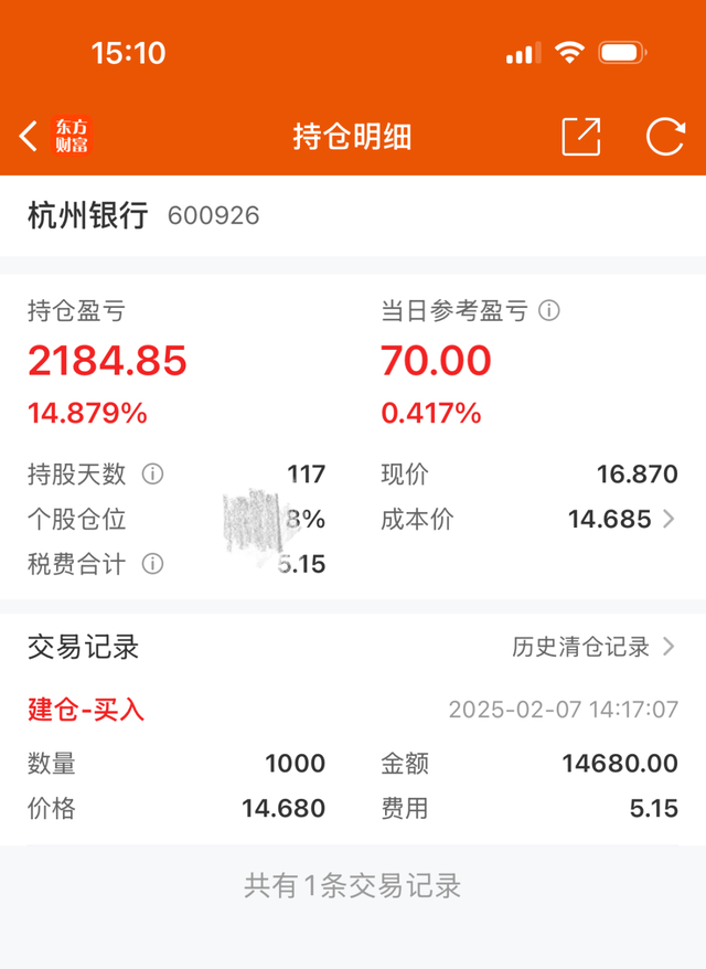 而这两天银行板块表现再度亮眼,轩轩这只银行股又连续两天在盘中创出新高,截至今天收盘,收益已达2184.85元,涨幅近15%。