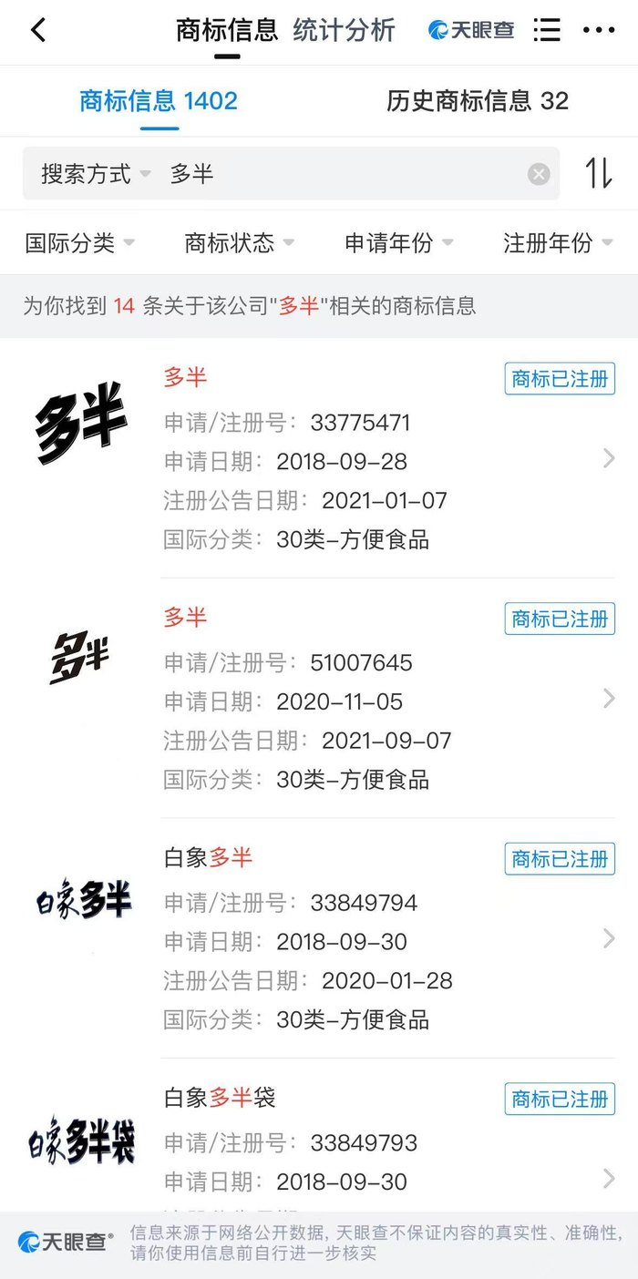 天眼查App显示,白象食品股份有限公司已成功注册“多半”“白象多半”“白象多半桶”商标,国际分类均为方便食品。