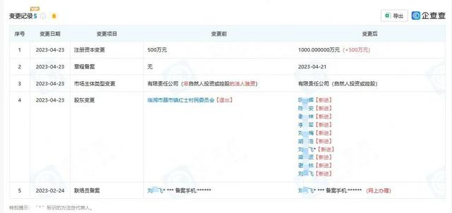记者通过企查查查询发现,该公司成立于2021年,法定代表人为刘某飞,经营范围为其他建筑材料制造、页岩空心砖生产及销售。在“历史变更”信息中记者看到,2023年4月发生了一次股东变更,临湘市聂市镇红士村民委员会退出(100%持股),由法定代表人刘某飞及另外9人共持该企业100%股权。
