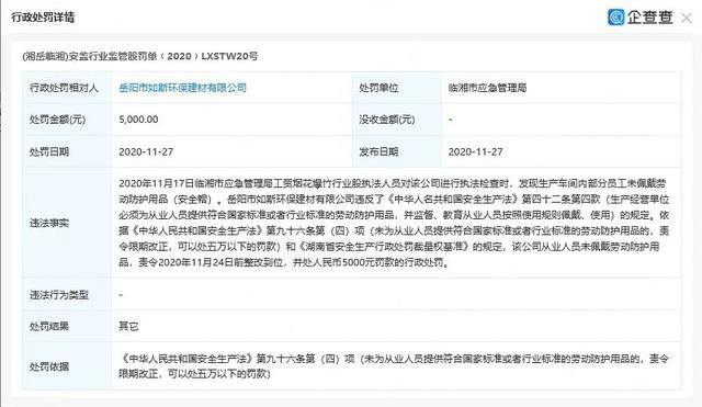 企查查显示,2019年9月17日,临湘市应急管理局执法人员对岳阳市如斯环保建材有限公司进行执法检查时,发现该公司生产车间未设置明显安全警示标志,违反了《中华人民共和国安全生产法》第三十二条生产经营单位应当在有较大危险因素的生产经营场所和有关设施、设备上,设置明显的安全警示标志。依据《中华人民共和国安全生产法》第九十六条第(一)项的规定。处罚人民币伍仟元(5000元)罚款的行政处罚。