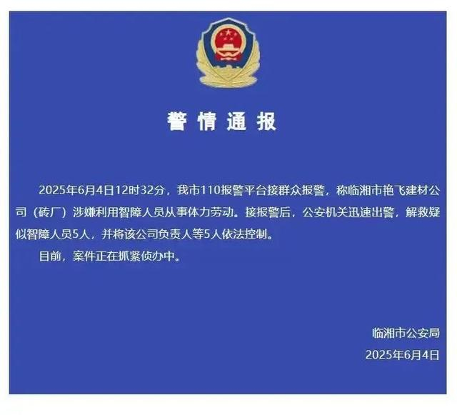 4日下午,临湘市公安局发布警情通报称,接报警后,公安机关迅速出警,解救疑似智障人员5人,并将该公司负责人等5人依法控制。目前,案件正在抓紧侦办中。