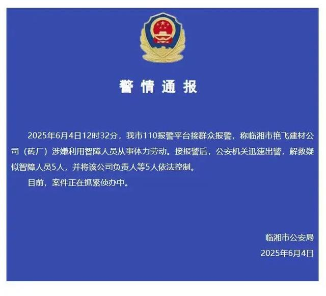 临湘市公安局4日下午发布警情通报称,2025年6月4日12时32分,我市110报警平台接群众报警,称临湘市艳飞建材公司(砖厂)涉嫌利用智障人员从事体力劳动。接报警后,公安机关迅速出警,解救疑似智障人员5人,并将该公司负责人等5人依法控制。目前,案件正在抓紧侦办中。