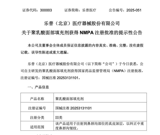 6月3日晚间,乐普医疗公告表示公司自主研发的聚乳酸面部填充剂获得国家药品监督管理局(NMPA)注册批准,注册证编号:国械注准 20253131101。