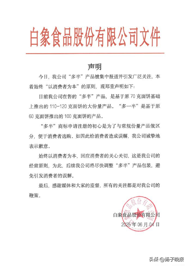 6月4日,白象食品股份有限公司的工作人员表示:“‘多半’确实只是一个商标,泡面实际克重以包装上的标注为准,其中有大克重的也有小克重的。”