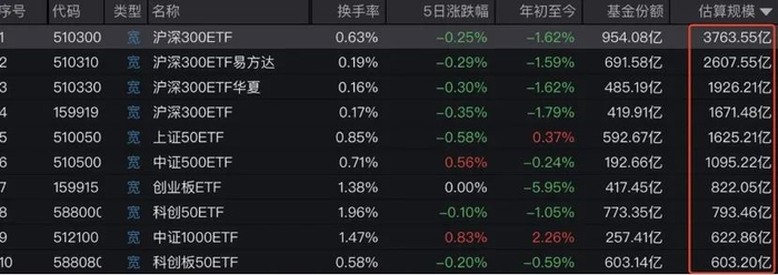 而且,千亿宽基 ETF 已有 6 只,4 只沪深 300ETF 领跑,华泰柏瑞沪深 300ETF 规模高达 3763.55 亿元,易方达沪深 300ETF 也有 2607.55 亿元。华夏上证 50ETF 和南方中证 500ETF 均超千亿,百亿 ETF 更是多达 70 只。
