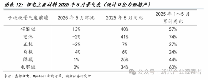 5月锂电排产跟踪:环比变动-4%~13%,同比增长6%~41%。2025年1~5月,碳酸锂/电池/正极/负极/隔膜/电解液预排产累计同比预计达24%~74%,其中单5月电池、碳酸锂同比超40%;电池、正极和负极排产环比小幅下降,主要系行业季节性淡季、2024年底至2025年一季度中美关税动荡下提前备库透支一定需求,同时原材料价格下降下游谨慎采购等。