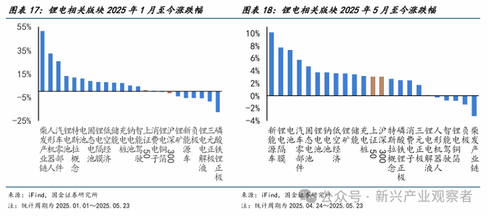 2025年5月以来,锂电关联板块表现较4月有所改善,市场情绪修复,超半数环节跑赢沪深300和上证50指数。其中,新能源车、锂电隔膜、电池等环节涨幅靠前,相对沪深300的涨跌幅分别为10%、8%和7%。