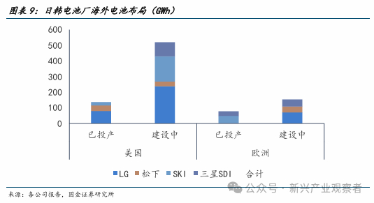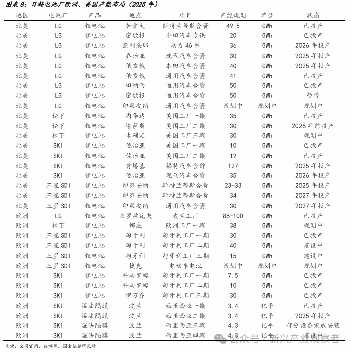 近年来,政策与需求双重压力下,日韩厂商加放缓产能落地节奏。在当前国际局势下,三星、松下与SK on在美建厂出现延期,主要系两方面因素影响:一是政策不确定性上升,IRA补贴虽具吸引力,但实施细则复杂,叠加大选可能引发政策调整,影响企业信心;此外,原材料溯源要求加剧日韩厂商的合规压力;二是美国电动车市场增速放缓,消费端对价格、配套设施及政策稳定性存疑,需求不及预期。