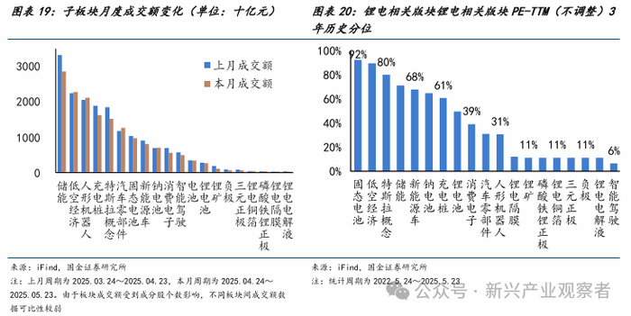 本月锂电相关板块多数环节月度成交额较上月企稳,储能、充电桩、特斯拉概念等板块出现小幅下降。