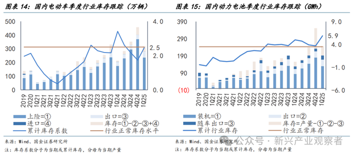 2025年一季度电动车、动力电池库存水平提升。我们通过电动车及电池产量及需求测算行业季度库存水平,4Q25~1Q25,电动车/电池库存系数分别由1.7/3.7触底,回升至2.5/5.9,其中动力电池库存位于合理水平(3.5)上方、电动车库存水平(2.5)合理。根据乘联会崔东树,新能源经销商厂家和渠道库存明显上升,行业库存总体压力逐步加大。