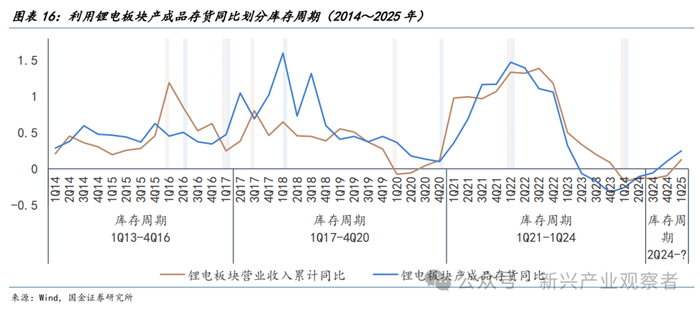 板块所处库存周期阶段:我们在2024年~2025年策略报告中即提到,锂电板块正经历库存周期触底至回升阶段,当前板块自2Q24正式进入复苏阶段,3Q24~1Q25为板块繁荣期,对应库存周期为“被动去库”至“主动补库”阶段。