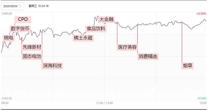 市场全天震荡反弹,创业板指涨超1%。截至收盘,上证指数涨0.42%,深证成指涨0.87%,创业板指涨1.11%。全市个股涨多跌少,全市上涨个股近4000只;全市全天成交1.15万亿元,较上一日放量成交116亿元,内资主力资金净买入1.372亿元,涨跌中位数为0.76%。盘面上,市场热点集中在消费方向,大消费板块持续拉升,美容护理、食品饮料、旅游酒店、零售等方向均表现不俗,若羽臣涨停续创新高,潮宏基、长白山、国芳集团等多股封板;AI算力硬件股表现亮眼,铜缆高速连接、光模块、电源设备等方向涨幅居前,华脉科技、得润电子、太辰光等涨停或涨超10%;摘帽概念表现活跃,汇金股份、威帝股份、中嘉博创等多股涨停;固态电池概念震荡走高,龙蟠科技、科恒股份等封板;稀土永磁板块震荡上行,广晟有色涨停。此外,深海科技、烟草、可控核聚变等方向均有所表现。跌幅方面,数字货币概念迎来调整,霍普股份跌超10%,海联金汇跌超7%;军工股集体下行,纵横股份跌超7%;物流板块走势较弱,新宁物流跌逾5%;无人驾驶概念表现不佳,福龙马逼近跌停。航运板块震荡下行,医药股部分陷入回调。消息面上,1、港股新消费概念股毛戈平、中烟香港、古茗、泡泡玛特、蜜雪集团、布鲁可均创出历史新高;2、AI狂潮仍未降温!两个月股价累涨逾45%、市值反弹1万亿美元,英伟达重回“市值第一”宝座;3、核能再迎利好催化!Meta与星座能源签署20年供电协议。