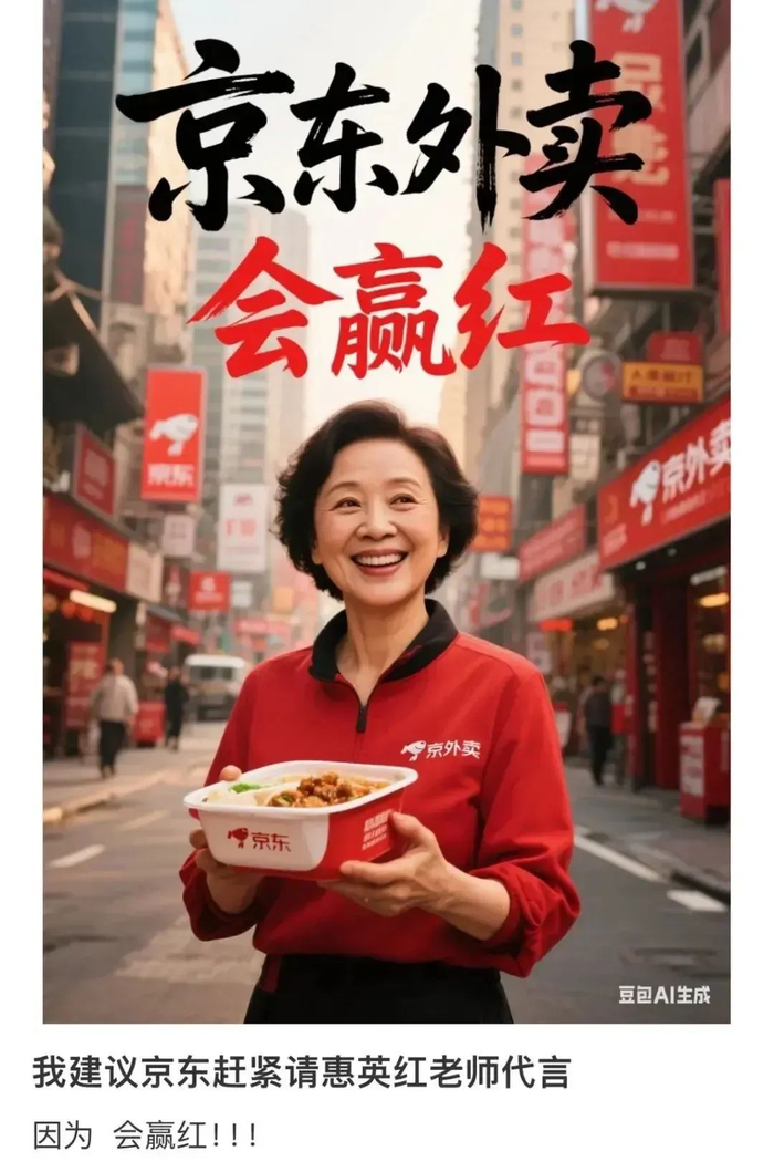 网友甚至自发加入战局,给京东外卖支招:红色品牌请“惠英红”“洪金宝”“韩红”来代言,连海报都有人P好了。
