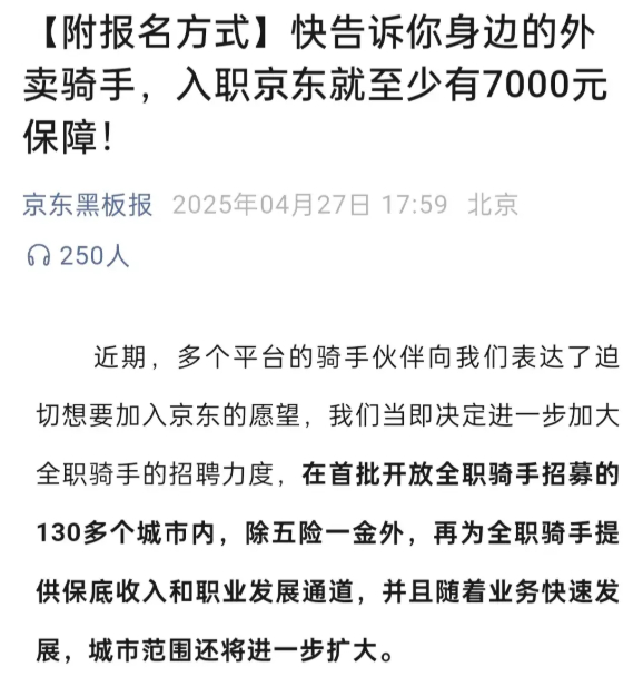 更重要的是,这些骑手不是“干完走人”的临时工,而是享受五险一金的全职员工。甚至连个人部分的社保费用,也由京东全额承担。