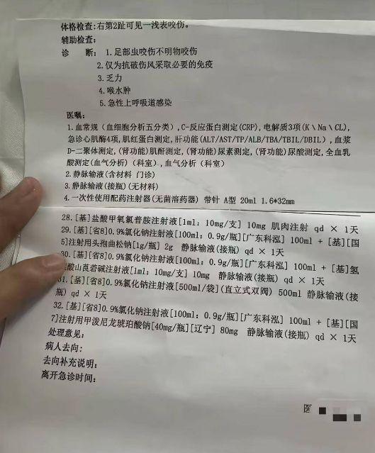此前家属在社交平台上发布病历报告,体格检查为:右第2趾可见一浅表咬伤。诊断为足部虫咬伤不明物咬伤,仅为抗破伤风采取必要的免疫,乏力,喉水肿,急性上呼吸道感染。于是有网友猜测是银环蛇咬伤所致。
