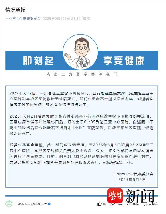 扬子晚报/紫牛新闻记者注意到在卫健委的通报中,该事件被表述为“一游客在三亚被不明物咬伤”,这一说法与此前网络上热议的“蛇咬伤”存在出入。6月4日,家属回应称,仍在等待调查结果。