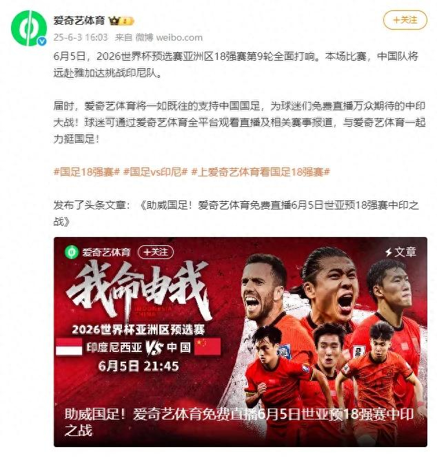 6月3日,@爱奇艺体育 发布直播预告,将免费直播世界杯预选赛亚洲区18强赛中国队和印尼队的关键之战。