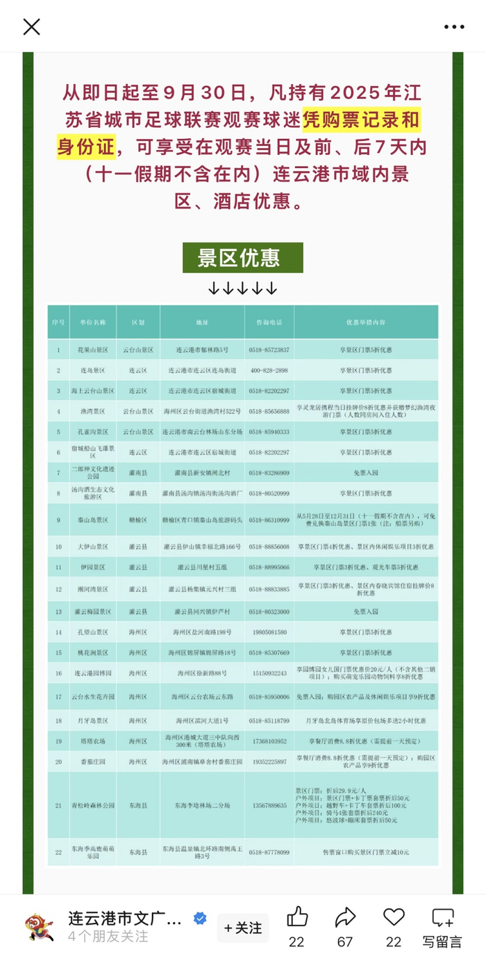 连云港市文旅局发布的消息显示,从即日起至9月30日,凡持有2025年江苏省城市足球联赛观赛球迷凭购票记录和身份证,可享受在观赛当日及前、后7天内(十一假期不含在内)连云港市域内景区、酒店优惠。其中花果山景区、连岛景区、孔雀沟景区均可享受门票5折优惠。