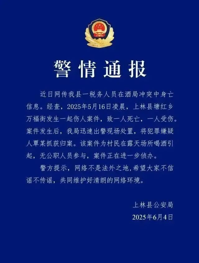 近日,网传广西南宁上林县一税务人员在酒局冲突中身亡。6月4日晚,上林县公安局发布警情通报。经查,2025年5月16日凌晨,上林县塘红乡万福街发生一起伤人案件,致一人死亡,一人受伤。案件发生后,我局迅速出警现场处置,将犯罪嫌疑人覃某抓获归案。该案件为村民在露天场所喝酒引起,无公职人员参与,案件正在进一步侦办。