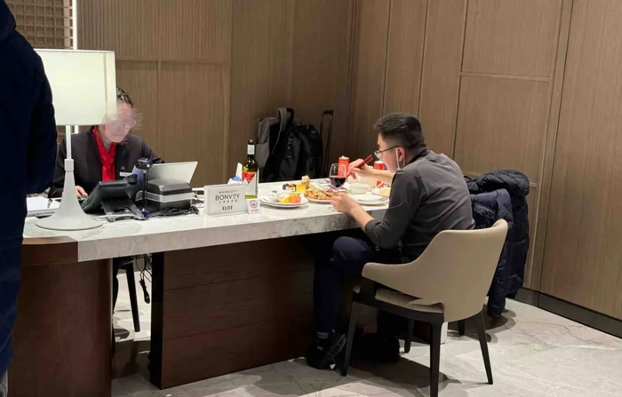 另一边,还有会员因为人太多,一时找不到就餐位子,索性坐在了前台美女旁,相顾无言的尴尬氛围中,酒廊版同桌的你就此上演。