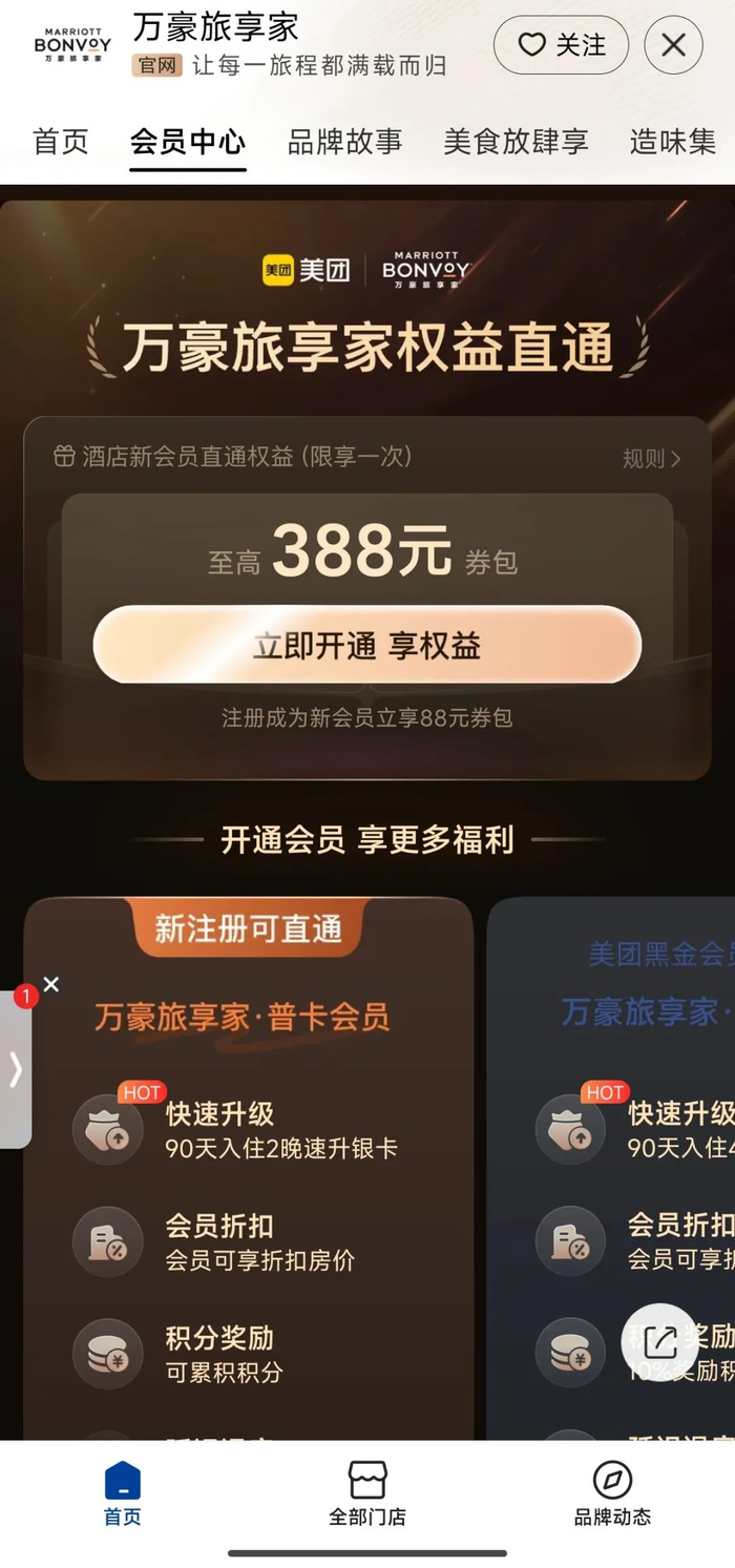 如果用户通过美团、大众点评注册成为万豪会员,且通过美团、大众点评App首次入住万豪时,可以获得总计价值388元的礼包。红包卡券也是两家联合的,既可抵扣万豪餐饮消费,也可以用于美团吃喝玩乐团购。