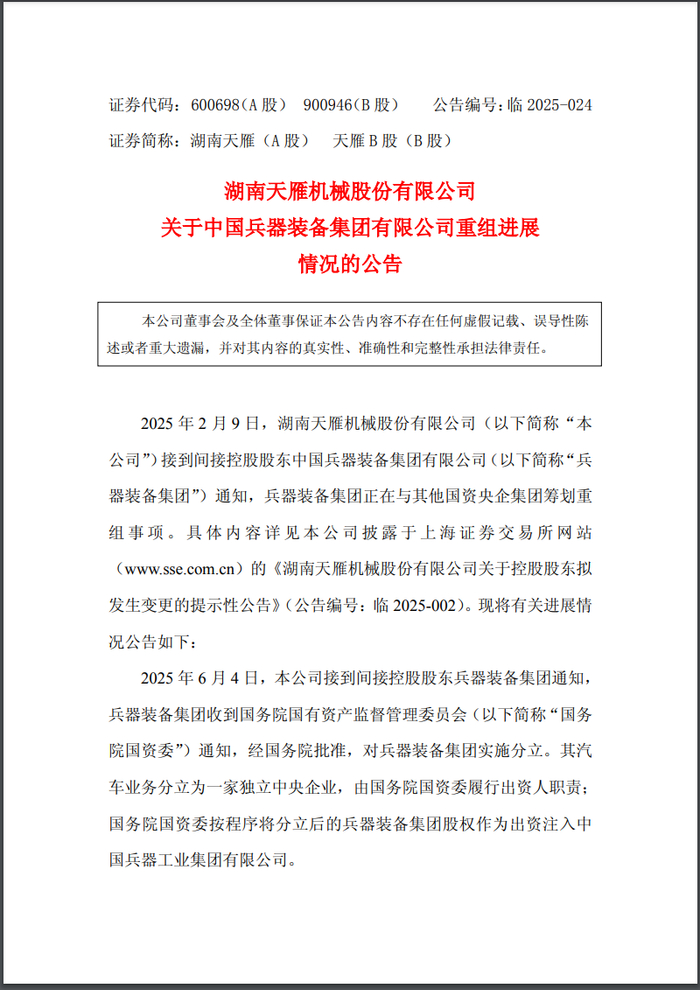 东安动力、湖南天雁、长安汽车表示,本次分立后,公司间接控股股东将变更为汽车业务分立的中央企业,实际控制人未发生变化。